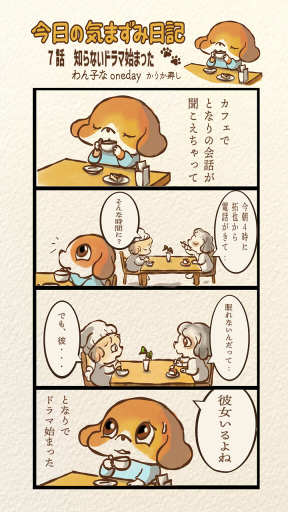 今日の気まずみ日記#7 #7知らないドラマ カフェでコーヒーを飲んでいたら、 となりの席から物語が始まった。 登場人物も関係性も知らないのに、 第一話を全部見てしまった気がする。 私はただの客。 でも席を立つまで、 チャンネルは変えられなかった。 作成者: rs1501200 ふんわり、ぷっくりのイラストで絵本をかいています。 リスやこぶたなどの動物のイラストが得意です。 千葉県在住 rs1501200のすべての投稿を表示。